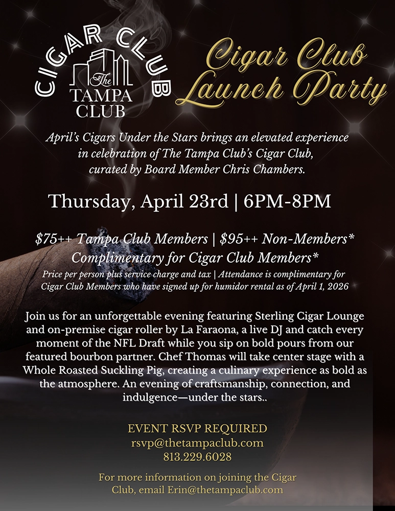 Perched 42 floors above Tampa in the heart of downtown sits Tampa’s premier private business and social club, The Tampa Club. Since our inception in 1981, The Tampa Club has become a diverse and inclusive club with a sophisticated approach to dining and service.